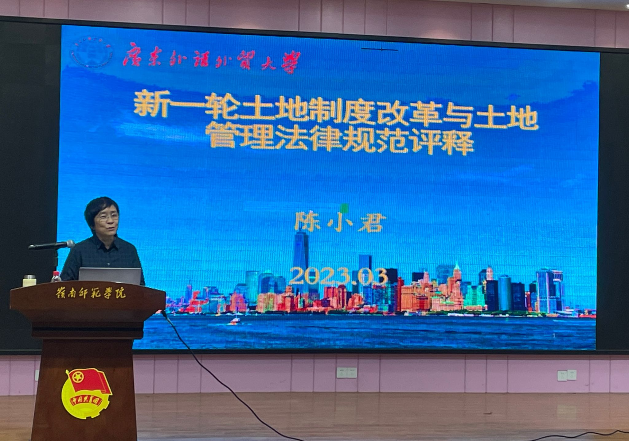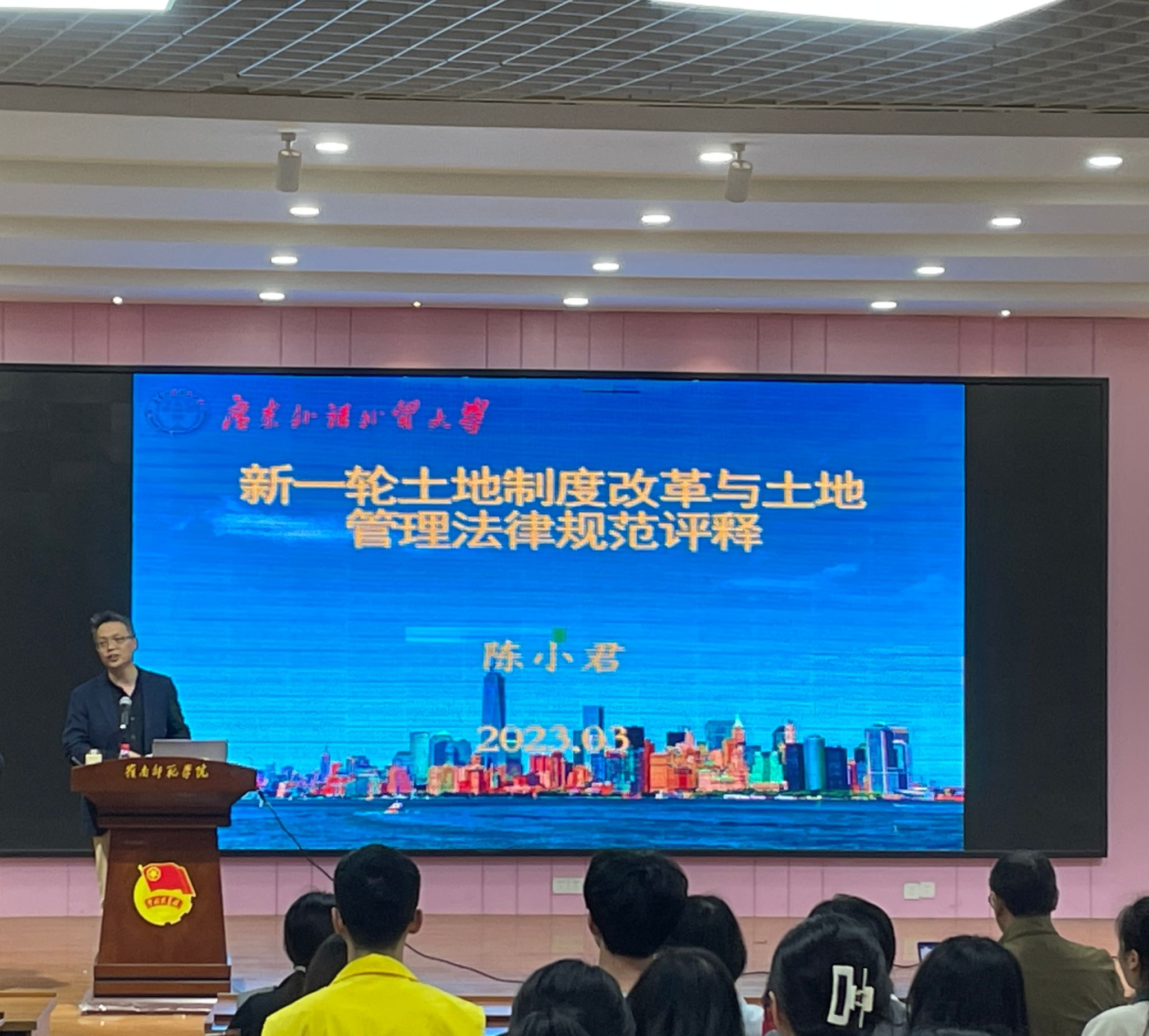 3月13日晚上,法政学院于弘雷楼311成功举办了主题为“新一轮土地制度改革与土地管理法律规范评释”的雷阳大讲坛。本次讲座由广东外语外贸大学“云山(法学)工作室首席专家”陈小君教授主讲。本次讲座由法政学院副院长于卫青教授主持,法政学院副院长娄伟教授、法学系主任韦志明教授、法学系副主任孟庆吉博士以及法学系各位专业教师、法学系2020级、2021级全体同学参加了本次讲座。