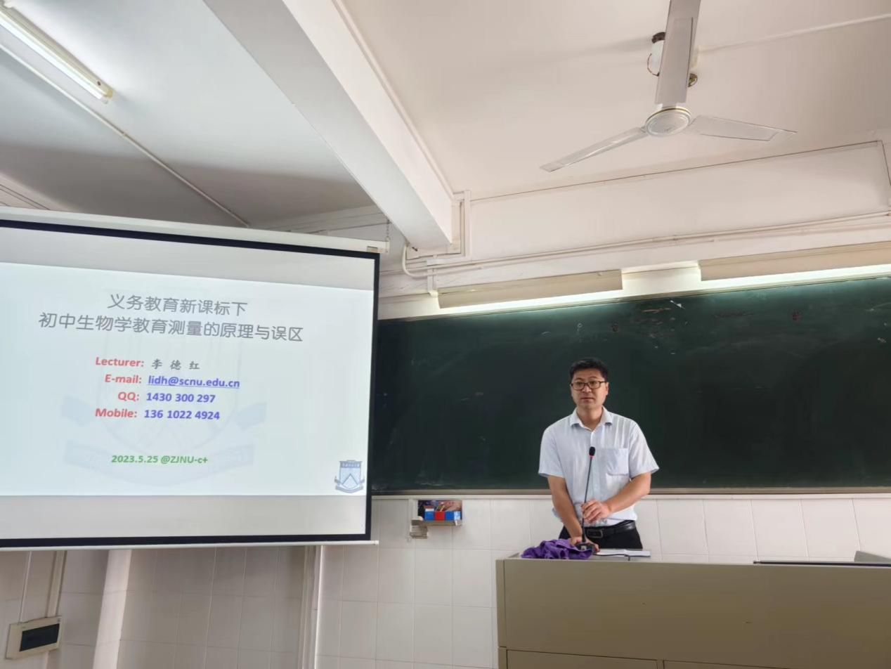 李德红的讲座主要从教育测量的标准、生物学试题的编制、试题与试卷的分析、生物学教学评价等方面展开。李教授以幽默的语言吸引同学们的兴趣,讲座期间以多则教学案例展开对教学评价的分析,从不同的命题角度阐述生物学试题命制的关键,帮助学生建立“如何判断生物学试题的质量”的思维。