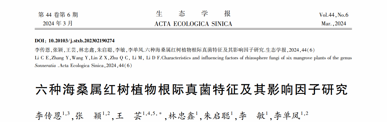 近日,生命科学与技术学院王芸博士带领课题组成员分别在《生态学报》和《微生物学报》杂志上发表了题为“六种海桑属红树植物根际真菌特征及其影响因子研究”和“培养法检测海滨浴场细菌多样性及耐药性研究”两篇研究论文,2018级海洋资源开发技术专业李传恩和2020级生物技术专业叶芷言分别为文章第一作者。课题组主要从事嗜盐微生物资源与生态学相关研究。