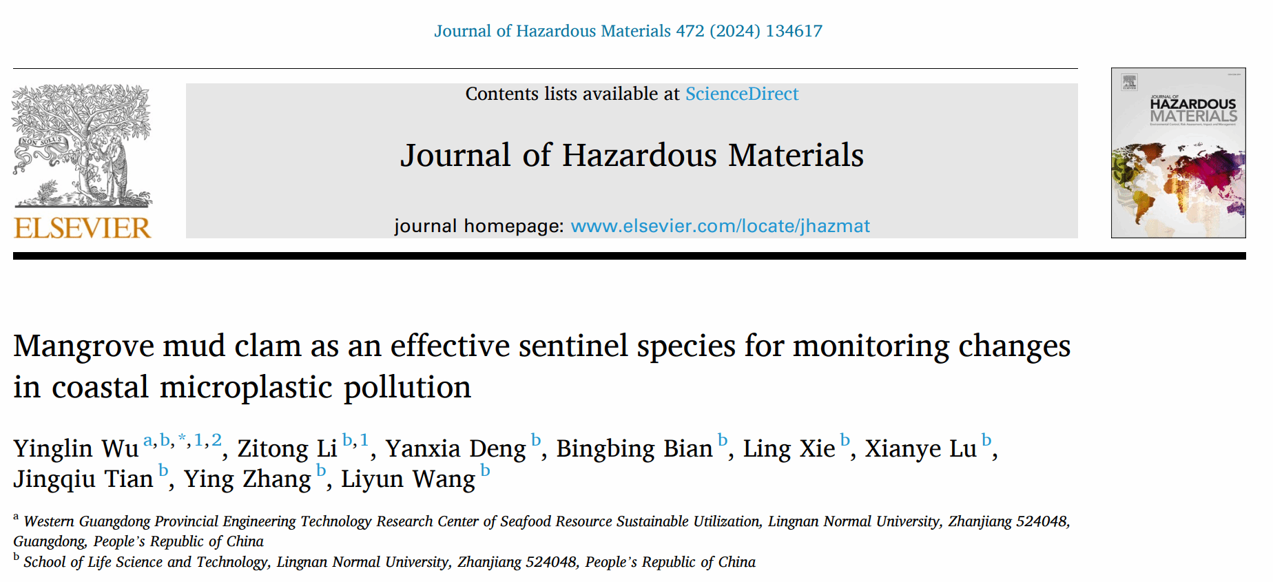 红树林处于陆海交界处,是最具特色的湿地生态系统,它的健康情况也越来越受到关注。近年来关于红树林生态系统的研究成为热点,生命科学与技术学院吴应林博士等教师多年来一直致力于红树林科学研究。吴应林主要从事海岸带环境污染及公众感知研究,已发表相关高水平SCI学术论文10篇。近日,吴应林指导海洋资源开发技术专业的本科生李梓彤、邓演霞、卞冰冰等在国际环境科学与生态学顶级刊物Journal of Hazardous Materials(中科院大类一区)上发表了题为“Mangrove mud clam as an effective sentinel species for monitoring changes in coastal microplastic pollution”的论文。该研究以红树林生态系统中特色物种为研究对象,系统分析该物种中微塑料的富集特征及其与人类活动的关系,评估了人类食用红树林贝类带来的健康风险。论文首次建议利用红树蚬为哨兵物种,以监测全球海岸带微塑料污染的变化,为红树林生态系统的健康评价提供了科学参考。