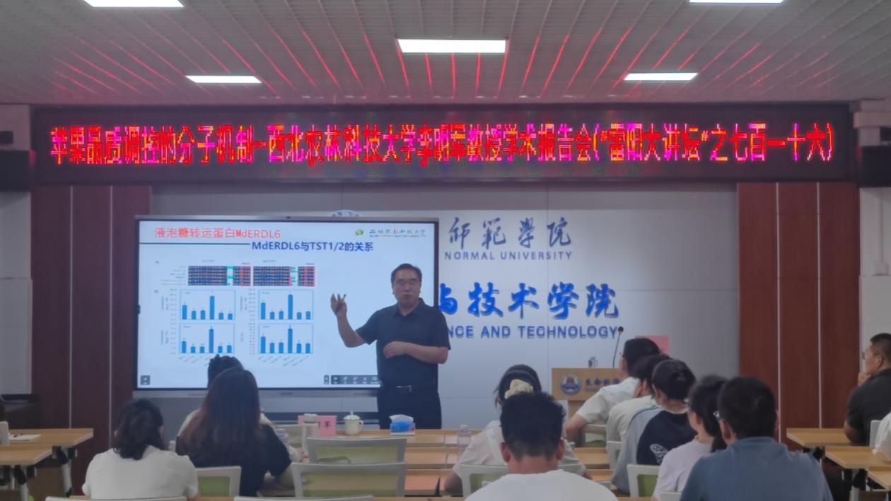 6月18日,生科院特邀西北农林科技大学教授,博士生导师,教育部青年学者入选者,现任科学与技术研究院副院长、兼任未来农业研究院副院长李明军做客“雷阳大讲坛”和“现代农业与海洋中心学术讲坛”,作题为《两类液泡糖转运蛋白协同调控苹果糖积累的机制研究》的学术报告。讲座由生科院院长刘锴栋主持。