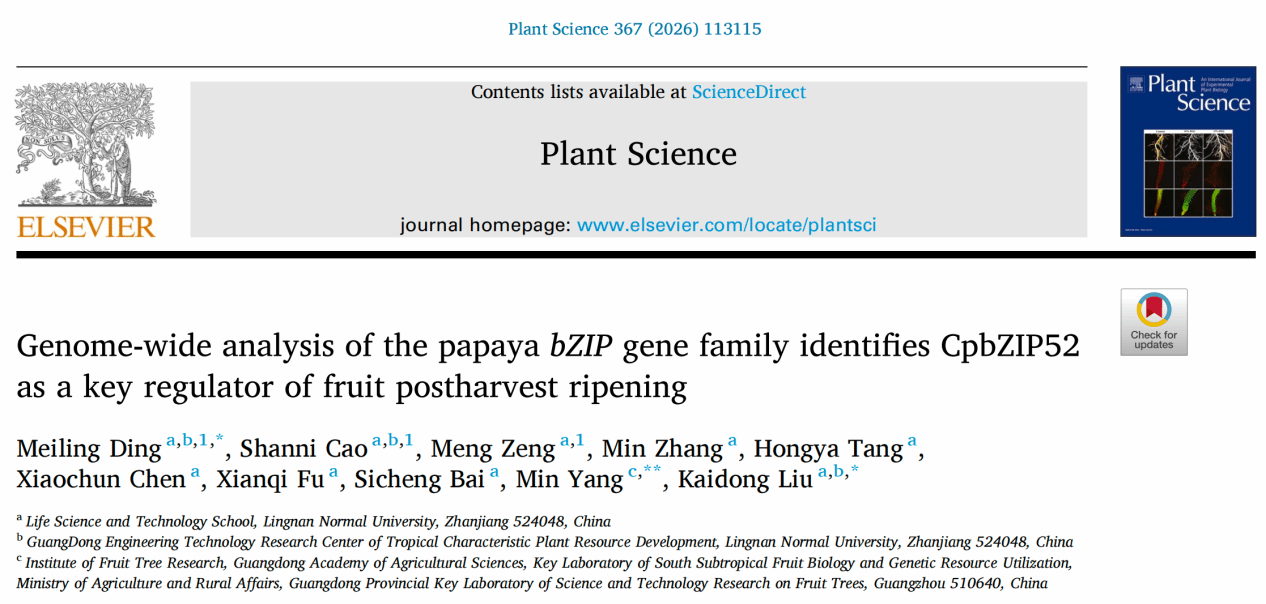 近日,生科院2025级生物与医药专业硕士研究生曾梦、汤红雅分别以共同第一作者、参与作者在国际知名期刊《Plant Science》(IF:4.1)上发表题为“Genome-wide analysis of the papayabZIPgene family identifies CpbZIP52 as a key regulator of fruit postharvest ripening”的研究文章,为番木瓜果实采后保鲜与品质改良提供了重要的理论依据与分子靶标。