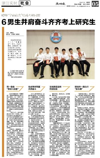 岭南师范学院出了一个“学霸宿舍”!昨日,记者了解到,该高校同一学生宿舍的6名男生,在结成考研同盟的强大凝聚力下,用汗水、毅力、坚持、友情一路奋斗,6人今年全部考上了硕士研究生。