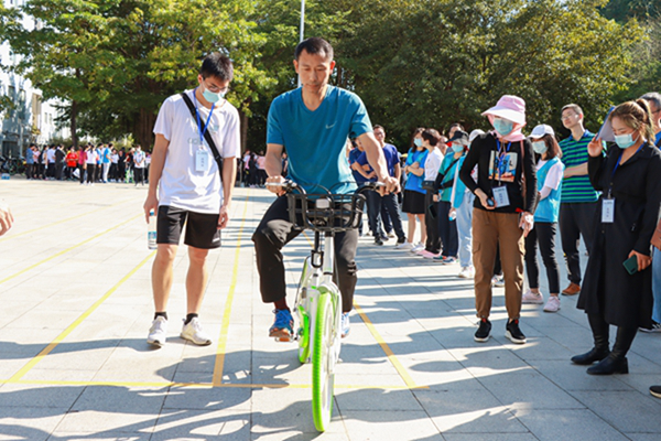 而在自行车慢骑的赛场上,参赛选手为争取最长骑行时间各出奇招,左拐右拐,频繁刹车,紧踩离合……有些选手在前半程把时间控制的非常好,但是在即将到达终点时,由于过于紧张,自行车失去了控制,双脚落地,导致成绩作废,赛场下的观众看到此景纷纷为此表示可惜。夺得男子组第一的网信中的王昌农老师表示:“在此疫情常态化防控期间,有这样难得的机会,可以让师生共乐,提高身体素质。”