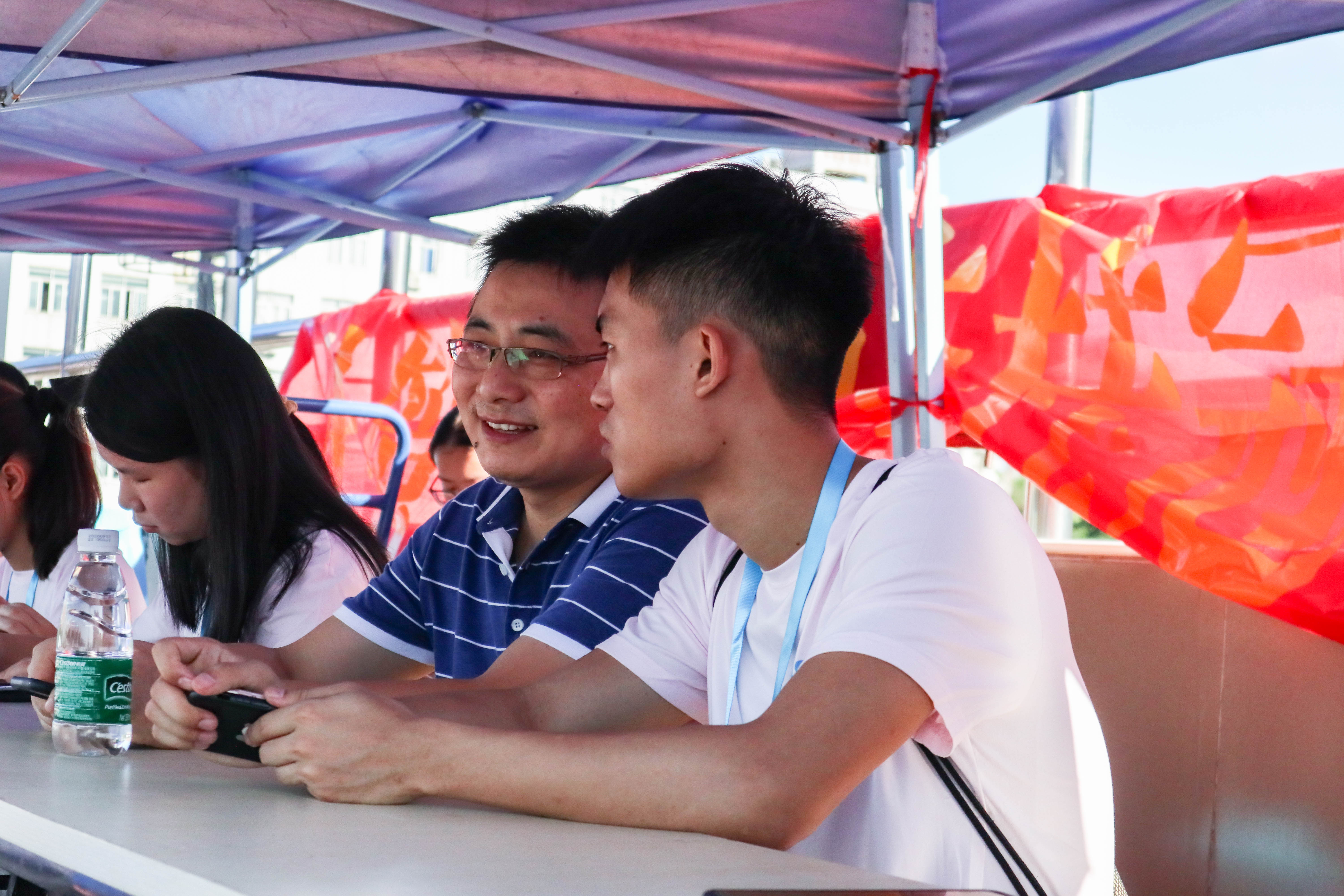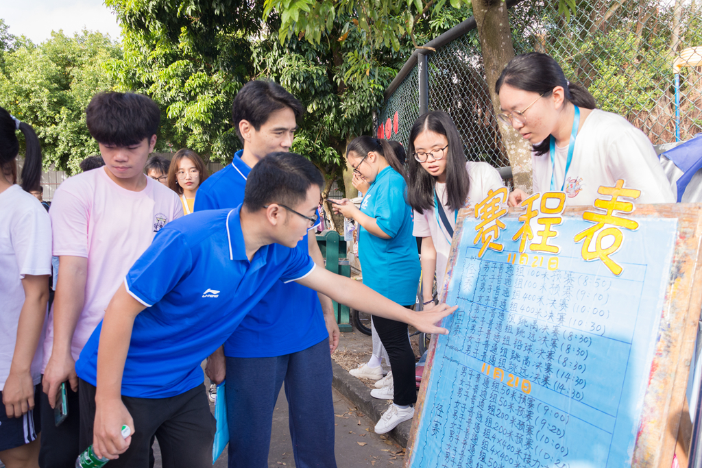 辅导员钟明杰、李从来老师观看赛程表(王桂凤摄)