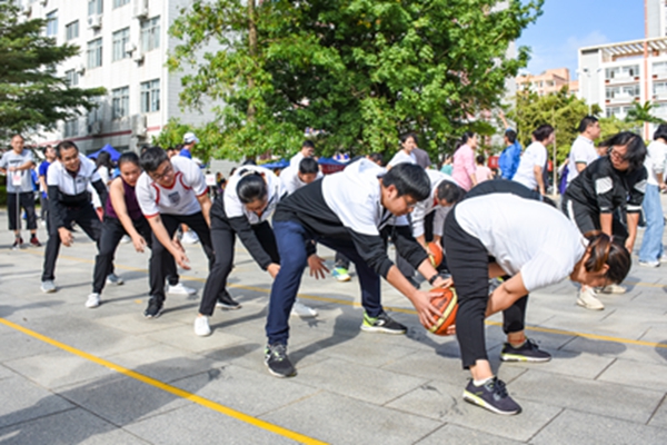 水底捞月也是一个团队协作的项目,老师们要默契配合,将球从胯下传递给身后的老师,每组的速度都非常快速,不分上下,比赛紧张焦灼,在场的观众也非常兴奋的为他们喝彩加油。最后还是机电学院以39秒多的成绩获得第一。