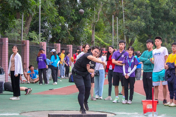 选手们将球握好放在右肩锁骨窝处,左臂自然前伸,身体反向转体90度并稍向前倾预摆,望远推球,铅球在空中划出一道道弧线。“比分很胶着啊!”此时场上有两名运动员的成绩只相差0.02米。“好球!”观众们齐声赞叹。选手徐江明顶住压力,扔出了8.66米的好成绩,最终夺下了本次比赛的冠军。