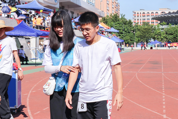 当运动员志得意满摘取桂冠时;当同学们不慎受伤需要帮助时;当赛场上一切工作进行得井然有序时;请别忘记,是志愿者们的坚守和付出保障着这一切。他们也是校运会赛场上一道美丽的风景线。