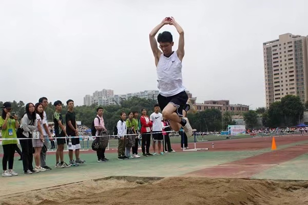 “哇,他跳的好远!”比赛有序开展着,选手们奋力一跃,那富有力量的肌肉线条,漂亮的运动弧线惹得观众频频称赞。在决赛的激烈比拼中,全锦平吸引了许多观众的目光,在场不时响起阵阵掌声。