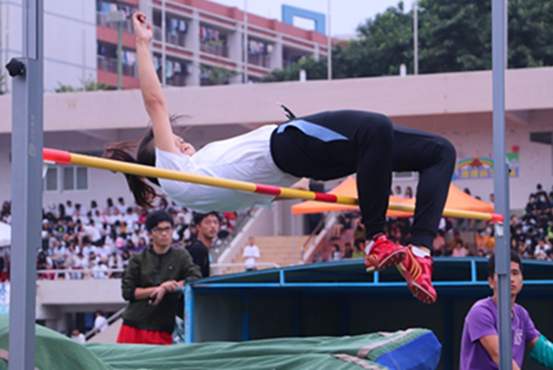 赛场上气氛活跃,选手们个个精神抖擞。为了更好的发挥,选手们一到场,做起热身准备,拉伸、尝试跳跃,尽一切可能尽快进入状态。起始高度为1.15米,每一个选手全神贯注。由于该比赛时间安排在早上八点,比赛时间较早,部分选手没有及时调整好状态,在前面三轮,需要反复跳跃过杆,有6名选手遗憾被淘汰。第四轮比赛场上剩余3名选手,选手们渐入佳境,三人均一次性轻松越过跳高杆。比赛进入白热化阶段,选手们竭尽全力,加速、起跳,纵身背跃,化成一道道靓丽的弧线越过跳高杆,身体稳稳地落下。整个过程中,运动员们的表现牵动着观众的心,最后18体教5班的司徒晓慧以1.38米的成绩取得第一,她勇于挑战自己,将高度加到1.43米并顺利越过。