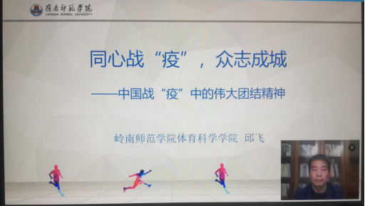 邱飞向在家学习的同学们表示问候,表扬了体育学子们严格遵从中央号令、听从学校安排,做好疫情防护和保护好自己,不给国家添乱的行动,特别肯定张振宇老师、郭琪达同学、邓沃均同学等师生在疫情防控中主动担当、勇敢站出来参与到所在街区、村庄的疫情防控的具体工作中去,展现了体育人青春有为、敢于亮剑、勇于奉献的精神。“这是一场人民的战争,没有人能置身其外,我们每个人都是战士!”邱飞指出,在自然面前,一个人的力量是微不足道,但是所有人团结、凝聚起来,形成同甘共苦、众志成城的力量就创造了武汉大决战的奇迹、中国战“疫”的奇迹。