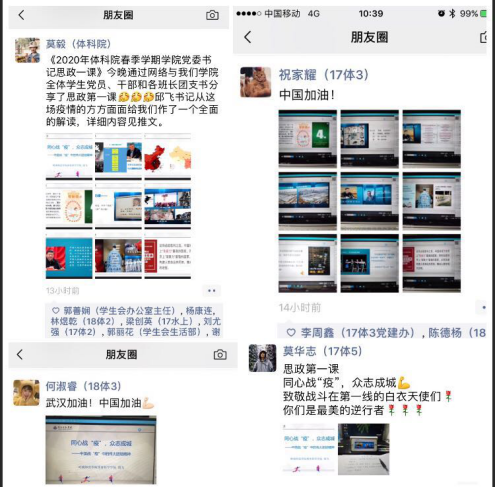 课后同学们纷纷在朋友圈写下学习体会。19体教5班陈泳泉表示,在这次的疫情中感受到了全国人民众志成城、互帮互助的情谊,也清楚了解了学校和学院的疫情防控工作和对学子们的关怀!“凝心聚力,砥砺前行”。19健身班戴锦荣课后表示,通过各国疫情防控工作的对比,充分认识到了中国的“硬核”领导力和中国制度在这场战“疫”中显示出的制度优势。