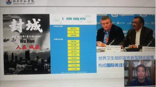 邱飞通过中华优秀文化中的成语、诗词和典故中蕴含的团结精神和长城、都江堰、红旗渠、两弹一星以及98抗洪等重大事件讲述了中华民族同舟共济、众志成城的伟大团结精神。他指出,这场战“疫”展示了中国伟大团结精神,验出了中国制度集中力量办大事的“真金”,中国制度在“战疫”中也显示出超强的组织动员能力。邱飞希望,同学们要永远记住临危受命逆行奔赴武汉84岁的钟南山院士、走出ICU病房摘下口罩脸上露出深深印痕的73岁李兰娟院士、乃至千千万万的从全国各地驰援武汉的医护人员这些时代的英雄,感悟在他们“最美逆行”里所展现出来的大爱精神和英雄品格。邱飞向所有逆行奔赴前线抗击疫情的人员表达了祝福,为武汉加油、为中国加油,期待疫情全面胜利后与同学们相聚在美丽校园。
