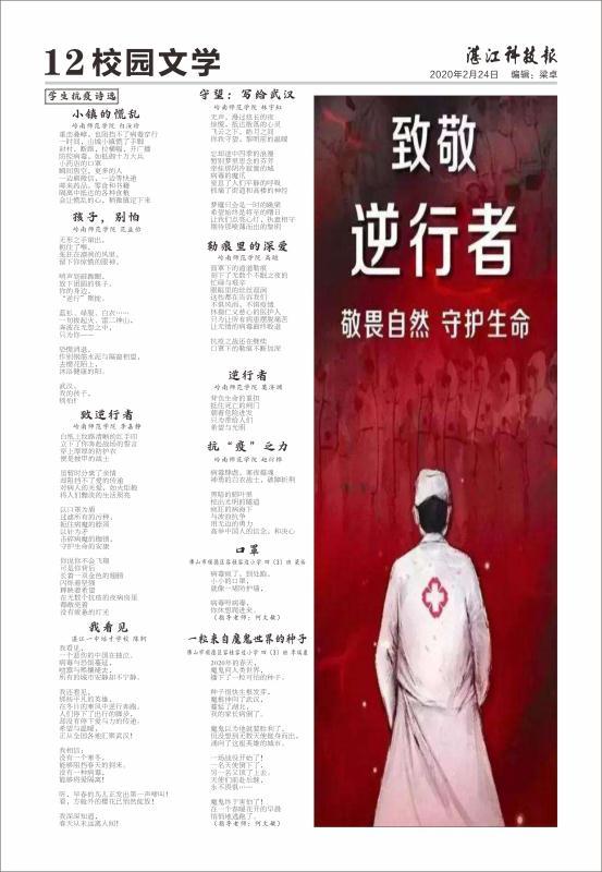 岭师新闻中心讯:3月20日,《湛江日报》“百花”版的“岭南师范学院学生抗疫诗选”,发表了岭南师院5位学生创作的课堂作业。这是该校文学与传媒学院张德明教授近日开展《诗歌创作》线上教学的成果。同时,他线上教学的思考《一首诗就是一次驰援——谈优秀抗疫诗歌的精神力量》也发表在3月18日的《光明日报》上。