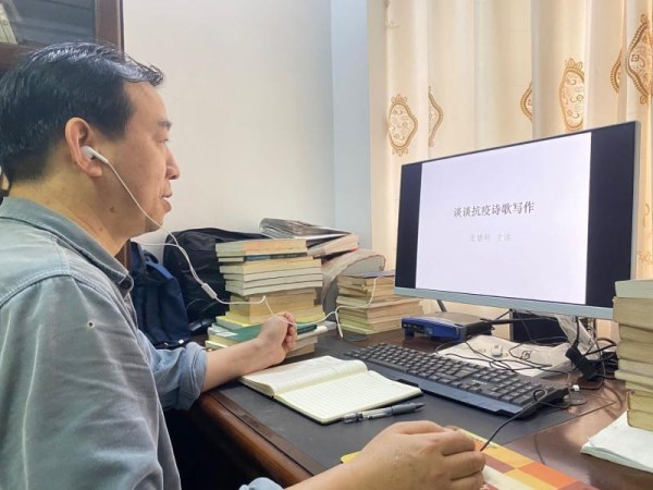针对文学圈如潮涌起的抗疫诗歌,张德明经常在在线上与学生进行交流分享。张德明认为,这种集束式爆发的文学产出,绝不是诗人一时的心血来潮和急于表态的心理使然,而是他们如战士奔赴战场一般的本能行动。这些抗疫诗歌,饱蕴着情感和思考,带着生命的热度与体温,是广大文学创作者满腔热血献战“疫”的最直接表现。