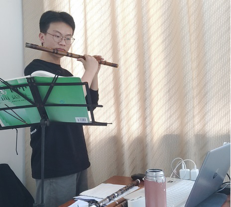器乐学生2017级音乐表演1班李嘉豪同学说:与平时的常规器乐课堂相比,线上授课除了音质稍差外,其实还有很多优点,比如老师提供的学习材料更加丰富、节省了很多“上课路上”的时间。