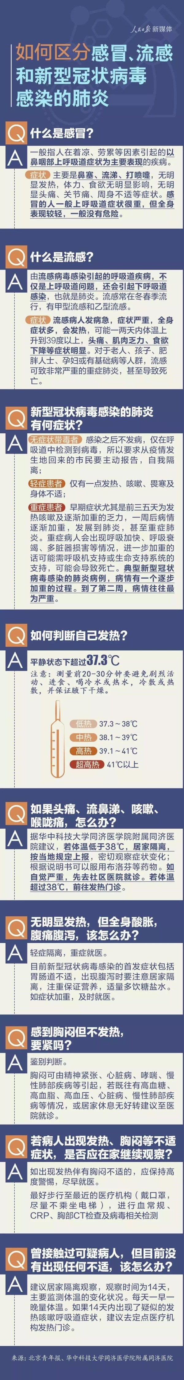 头痛、流鼻涕、咳嗽、喉咙痛怎么办?如何判断是否发热?如何区分感冒流感和新型冠状病毒性感染的肺炎?一图了解