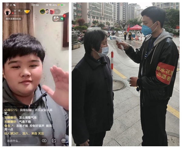 王业升开设线上“升”歌嘹亮公益声乐小课堂(图左),吴宏鑫为出入人员测量体温(图右)