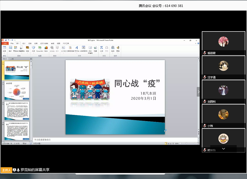 此次线上主题班会,有利于师生增进感情,并让同学们坚定打赢疫情防控阻击战的信心,坚决配合和支持学校学院疫情防控的各项工作安排,合理规划在家的学习生活,为“停课不停学”工作的开展奠定了基础,为打赢这场疫情防控阻击战提供了保障。