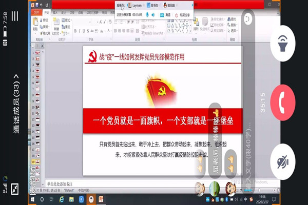 屈书杰、张晓婷和郑颍等党员同志就“战疫一线如何发挥党员先锋模范作用,切实做到防疫教学两不误”的主题纷纷发言,气氛严肃而热烈。大家纷纷表示:我们要积极参加疫情防控相关工作,将疫情防控与高校思想政治教育相结合,牢记立德树人教育的初心,支持学校、学院做好教学、科研和管理等各项工作。我们作为教学的一线教师,要尽自己的最大努力做好网络线上教学,在疫情环境中,保证线上的教学质量,上好线上的每一堂课;作为管理学生工作的辅导员老师,每天坚守岗位在线排查,确保学生的身心健康。