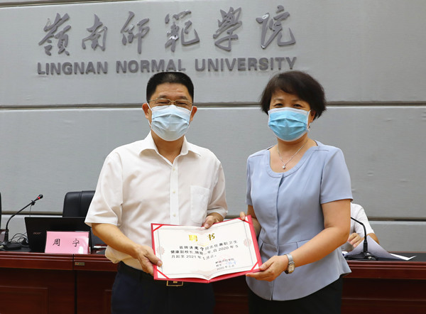 会上,湛江市中心人民医院副院长,硕士生导师、主任医师、教授周宁,被聘为学校兼职卫生健康副校长。接到聘书后,周宁为大家做了《后疫情时期,学校防控策略》的专题报告,从七步洗手法,到口罩的佩戴、重点场所的卫生管理、常见消毒剂的正确使用等方面作了现场辅导。
