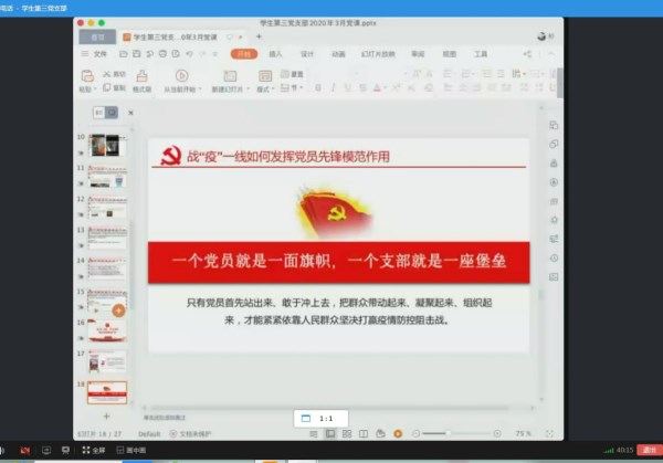 为贯彻落实习近平总书记关于打赢疫情防控阻击战的重要指示精神,外国语学院学生第三党支部于3月18日20:30组织召开了线上组织生活会,陈韵桥书记利用qq群视频中进行“云”党课,支部全体党员共同参与会议。