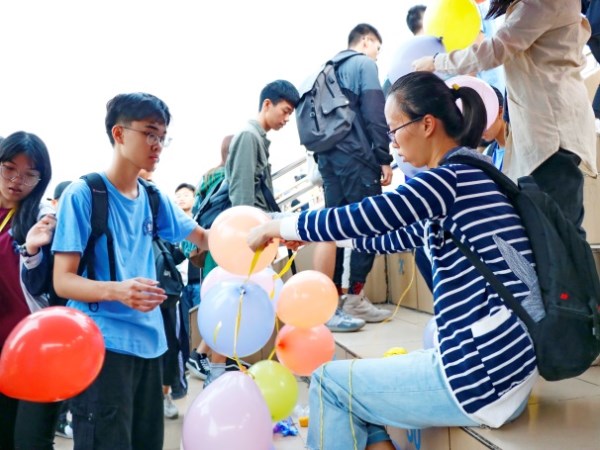 他们是见过岭南师范学院冬日五点漆黑的夜的人。15号当天,校园的鸟儿还没苏醒,他们已经在黑灯瞎火中布置大本营。桌子、椅子、院牌、“物理号”火箭卫星、可爱表情气球、精美手工制品、龙虎榜......整整齐齐的于天亮时刻呈现在大本营一条街!