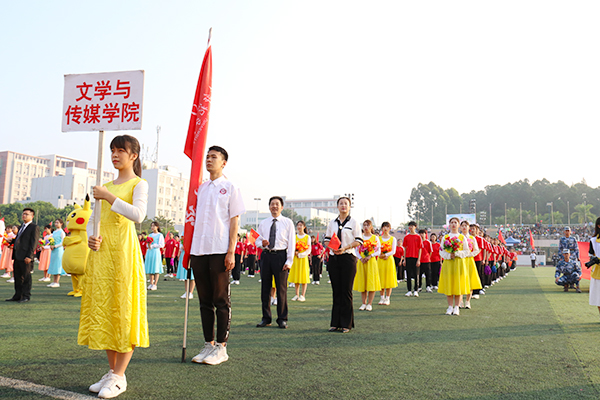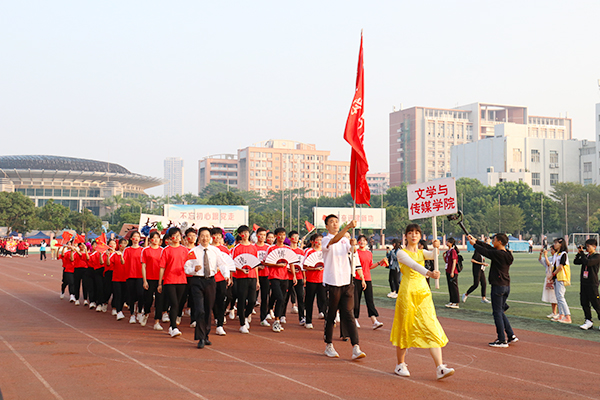 风和日丽,秋风送爽。11月15日上午7点半,我校第二十七届学生田径运动会在雷阳区田径场徐徐拉开序幕。作为开幕式的第一个代表团,同时为庆祝中华人民共和国成立70周年,牢记“不忘初心,牢记使命”的红色使命,文学与传媒学子身着鲜红服装,踏着欢快的乐曲,井然有序地作为入场。金色的阳光照耀在青春的笑脸上,手中的红旗迎风飘扬,文传方队意气风发、斗志昂扬,迈着整齐划一的步伐,高声齐喊“青春似火,超越自我。名不虚传,卓越文传”的口号,气势如虹,铿锵有力,彰显了文传学院在校运会上一往无前、所向披靡的决心。