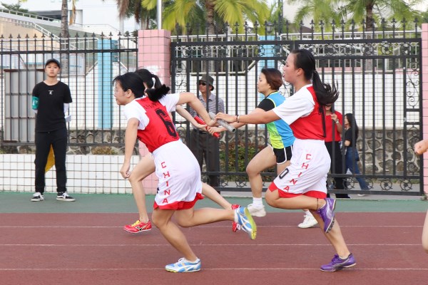 万众期待中,女子普通组4×100接力赛的发号枪声“砰”的一声响起!赛道上的运动健儿们犹如脱缰之马,全力奔跑在这400米的征途中,为各自学院的荣誉而战!起跑、奔跑、冲刺、伸手、接棒、再次奔跑、再次伸手接棒……经过三次交接,终于到达最后的冲刺阶段!距离重点线50米左右,最后一棒的运动员们就像一往无前的传讯兵一般,全力冲刺!将各自手里的接力棒送到了终点!