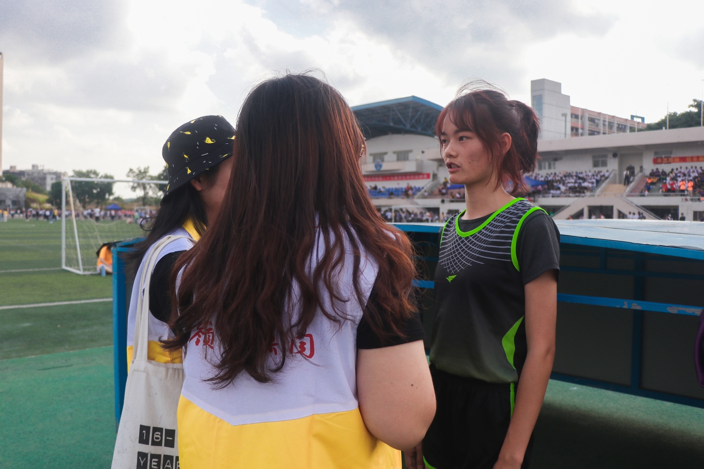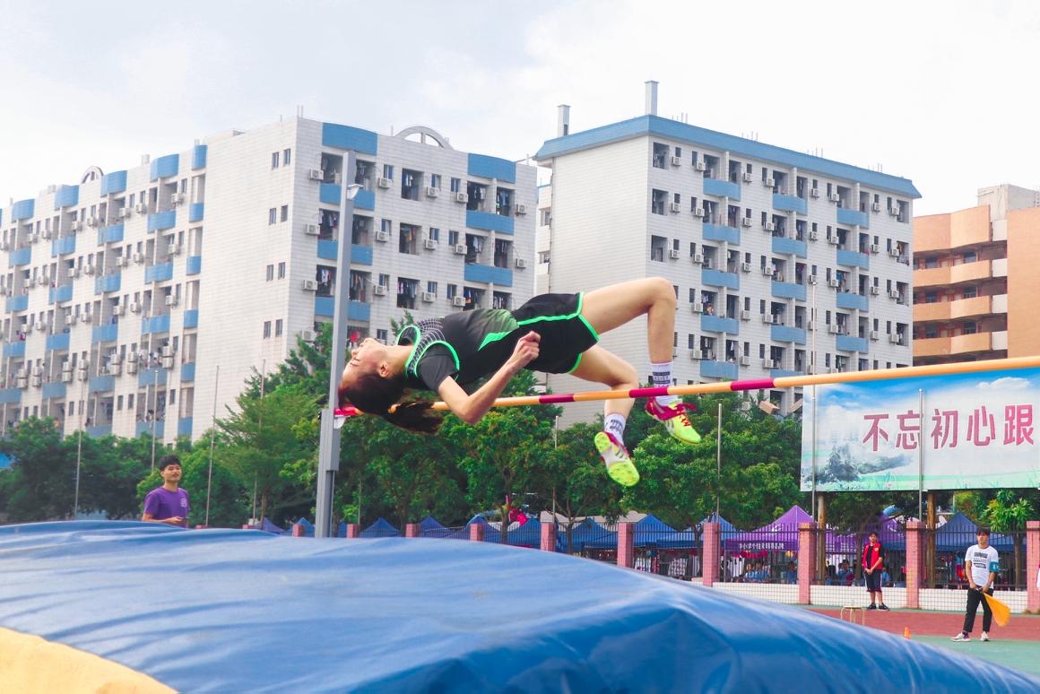 在跳高区域,一道身轻如燕的身影一闪而过,一道完美的弧线在空中划过,过了!她就是来自18体教3班的梁冰燕。她从小就特别喜欢体育运动,小学就开始接触跳高这项运动项目,到高中已是一名基础扎实的准跳高运动员了,现已是校田径队队员。“梁冰燕有一定的体育天赋,且自身也重视锻炼备赛过程中心理素质特别稳定,不受外界干扰。”校队跳高组主教练陈涛是她的指导教练,对梁冰燕给予了高度赞誉,今天也来到的比赛现场为她提供科学指导和坚实的臂膀。依靠着扎实的基础,梁冰燕不断地大放光彩,在今年五月份的广东省大运会中,以1.59的高度荣获跳高组第二名。
