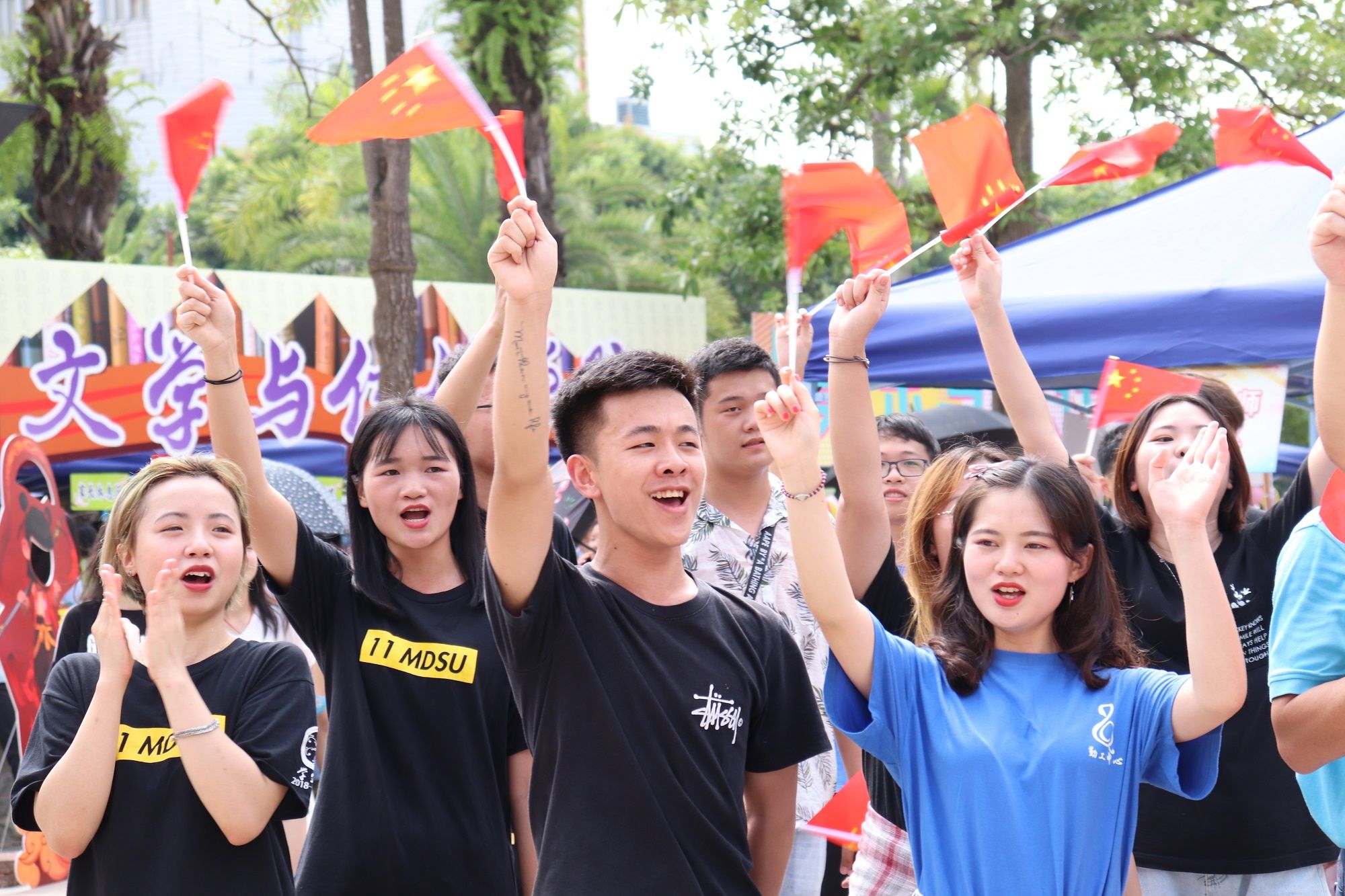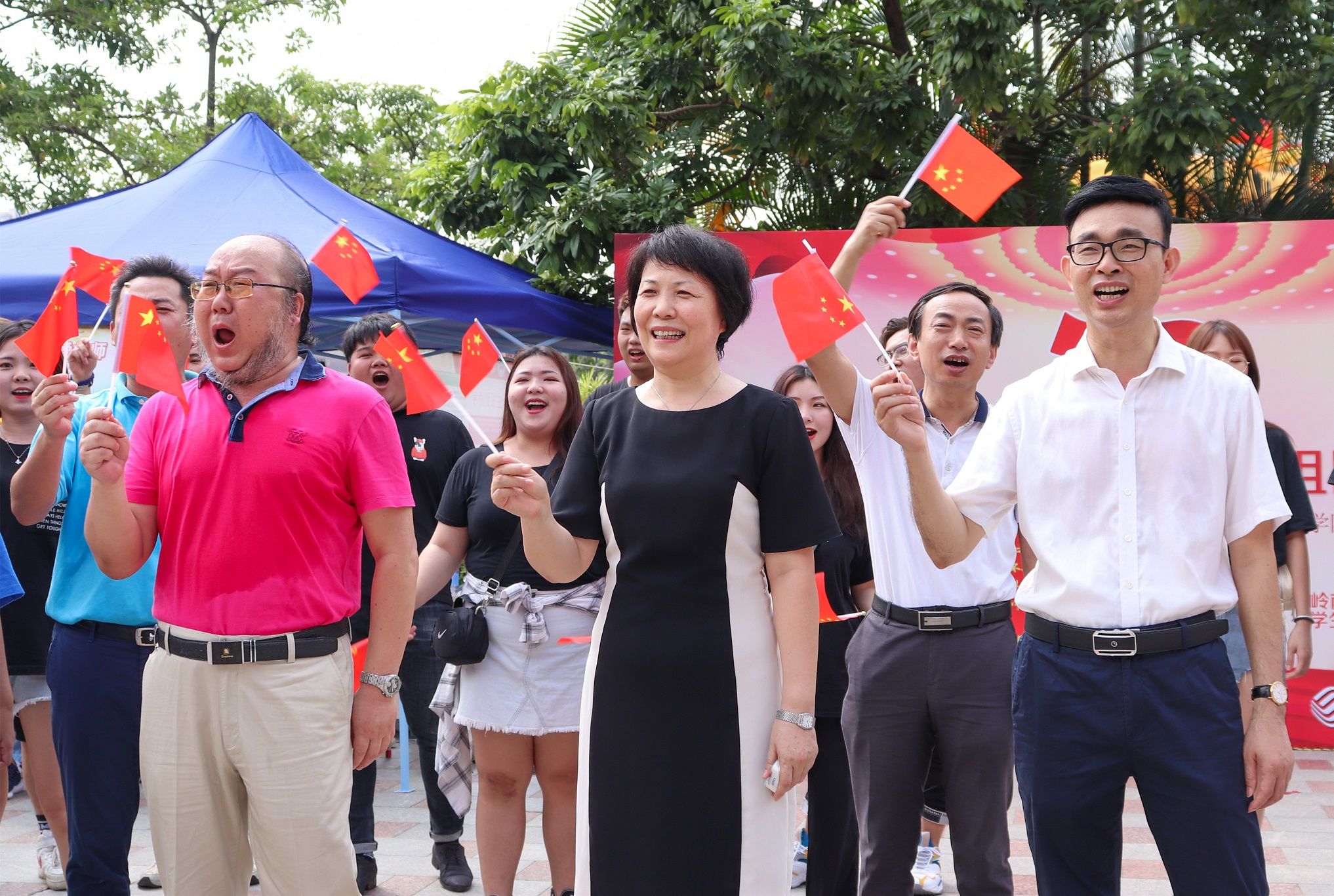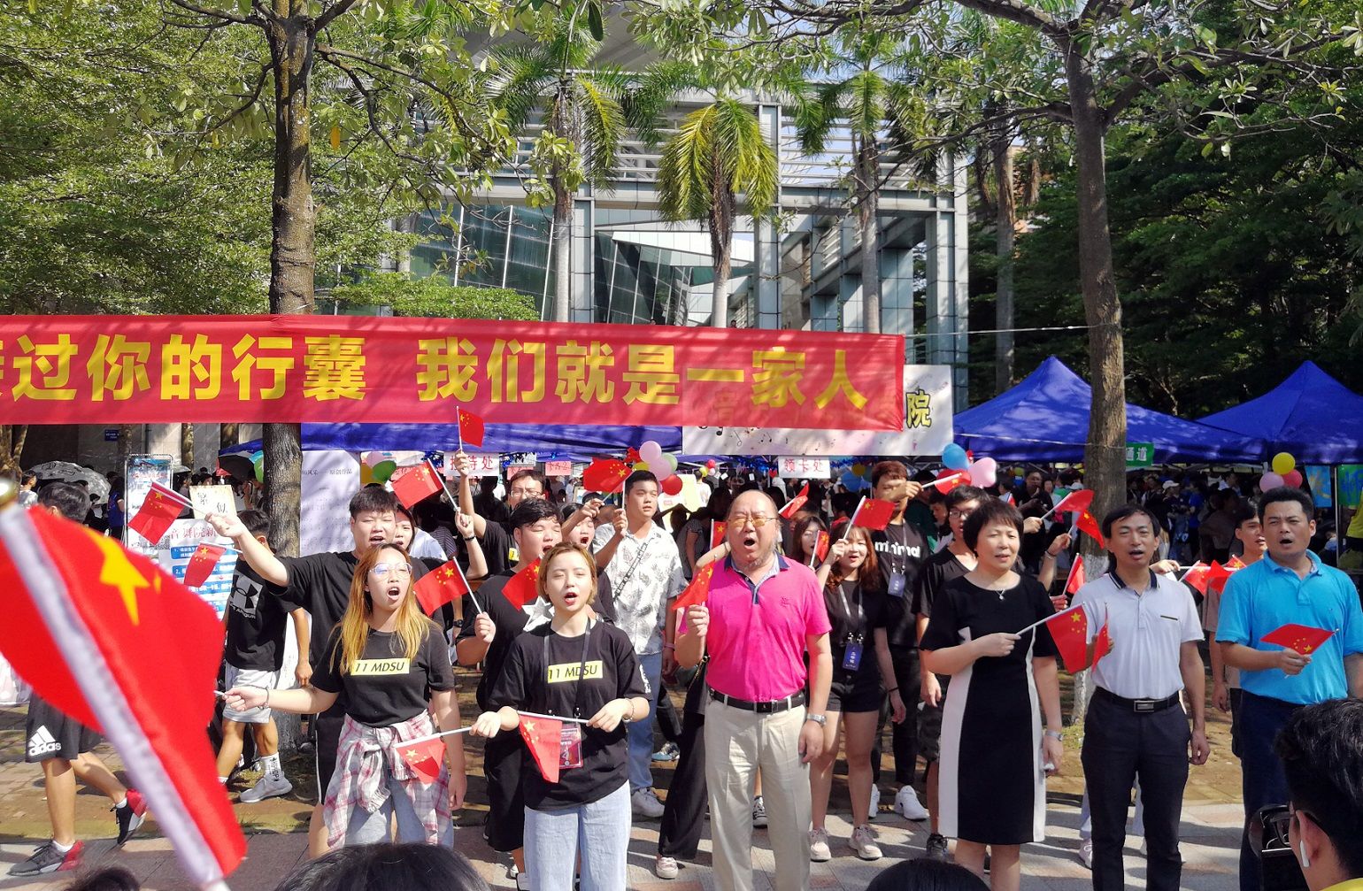 “突如其来”的快闪点燃了现场师生的热情,岭南师院校长兰艳泽、党委副书记黄达海等校领导,也情不自禁地加入到“快闪”之中,他们与现场师生一起挥舞着小国旗唱了起来。现场越来越多的学生围聚过来,拿出手机边拍摄边参与其中,大家纷纷跟着节拍大声地唱了起来,让报到的新生和家长感到格外的亲切。