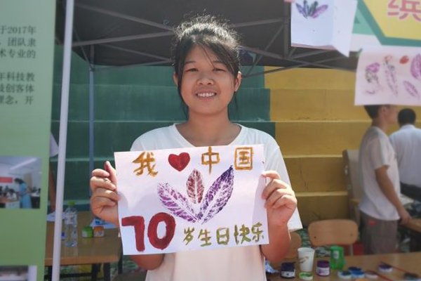 “今年的活动洋溢着浓浓的爱国氛围,国旗、天安门、天坛成为了创意作品的主元素,大胆表达出‘我爱祖国’、‘祖国生日快乐’等献礼中华人民共和国成立70周年的心声,我的内心也很激动。”来自18生本3班的叶文韵兴奋地说。