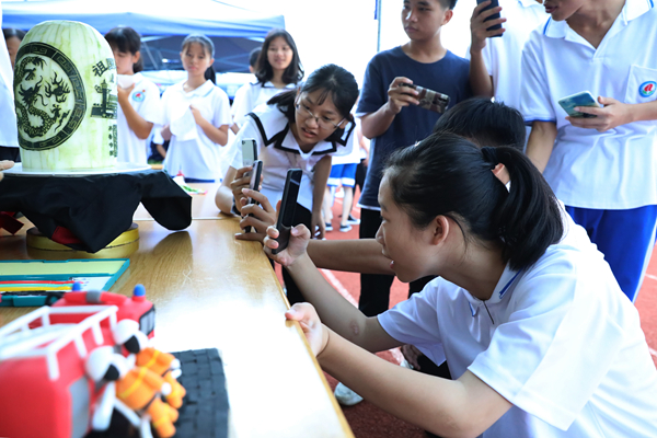 岭师新闻中心讯:“我们用烹饪食材做出《祖国印象》,是为了给中华人民共和国成立70周年献礼。作品以冬瓜外皮雕刻出龙凤及天安门广场,广场上空刻着‘祖国万岁’的一行粗字,再别出心裁地刻上‘科普中国’二维码。”9月22日上午,在2019年湛江市珍稀动植物博物馆全国科普日活动启动仪式现场,我校青稞生物创客教育团队参展的创意作品引来现场观众纷纷“点赞”并合影留念。