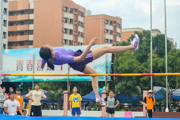 岭师新闻中心讯:看,跳高赛场上那一抹紫色越过了150cm的栏杆,如蝶一般轻盈。她后背弯曲的弧度恰到好处,轻巧地越过栏杆。她就是跳高新蕾——来自体科院18体教的梁泳燕。在第二十六届校运会女子专业组跳高比赛中,她以150cm的成绩夺得冠军。