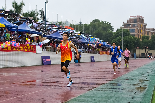 上午10时许,在偌大的运动场上,始终有一抹金黄色的身影在一众运动员中遥遥领先,他们风一般的奔跑,快速而稳准地传递接力棒。发梢和衣服已经湿透,那滴落在赛场上的水已分不清是雨水或是汗水。