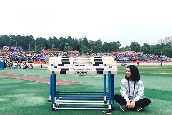 因为喜欢运动这个契机,她与校运会结了缘,从此就爱上了赛场上的感觉。记得一次夜晚的训练,出现了严重的失误,“那天晚上灯很暗,看不清,我整个人从栏上翻了过去。”当时摔得很严重,她非常伤心,以至于让她觉得比赛没有了希望。但是,“因为热爱,我觉得坚持就是胜利,喜欢就不要放弃。”她这样说道。这个因为热爱的信念支撑着她坚持下来直到走下赛场的那一刻。在她身上所体现出来的坚韧不拔的体育精神让人为之动容,一个音舞院的女生有着体育人的毅力和勇气,让她一次又一次地挑战自己,走到让自己满意的高度。