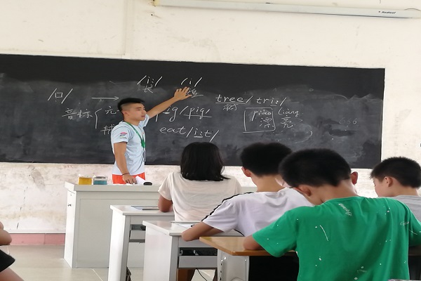 在讲课之前,代课英语老师陈振毓让高年级的学生做了一份简单的测试题以及唱字母歌来提升他们对英语单词的敏感度。其后,陈振毓老师通过汉字拼音,引导同学们用音标来拼读单词。随着课程的进行,陈老师给同学们总结联想法、类比法两种方法来学习音标拼读。此外,陈振毓老师在课堂上多次和同学们提到他希望在这短短的十天里可以教给同学们更多的方法去学习英语这一门学科。下课铃声响起,但是同学们都意犹未尽,拿起英语资料径直跑向讲台请教老师,直到下一节课的上课铃响起才恋恋不舍地回到座位上。