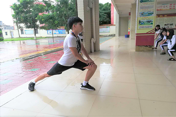 在向学生阐述并全体通过后,陈翠兰便指挥学生排列整齐,进行游戏开始前的热身运动,她一边要在前方带着学生热身,一边要盯着他们是否做得到位。