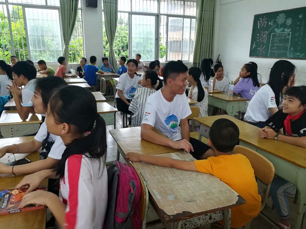 开班仪式前,“超活力”队队员们,冒着风雨在学校门口迎接着到来的小朋友,并将小朋友们送到教室里。在队员的带领下,南三中心小学的小朋友有序地端坐在椅子上。队员们也热情地与他们交流着,让他们熟悉我们的实践队。