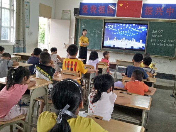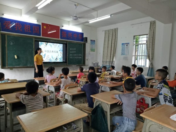 7月16日下午,“弈鸣”社会实践队支教组组长莫炜婵在光豪小学教室为三、四年级的同学进行了“古典乐器”的课程教授。