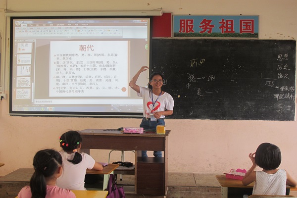 老师逐一介绍了公元纪年法的由来、中国古代的朝代发展、各种古代物品的样子。老师在介绍过程中积极与学生互动,学生也非常配合老师积极回答问题。。在教授科学发展的时候,老师采用抢答的方式去介绍科学发展,老师采用了积分制的形式去统计分数,这样学生们十分活跃。课堂的最后,老师讲解了炎黄子孙的来源,让学生们充分认识到中华民族发展的源远流长。