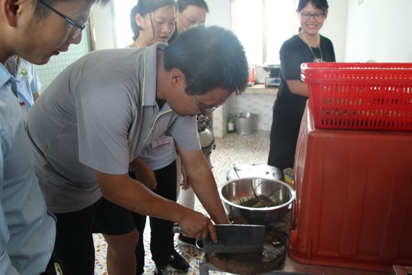 郑晓辉去到了队员们的宿舍进行视察,他指出安全问题是必须要保证的,实践队内女队员所占的比重较多,所以安全问题与自我防卫意识是要有的,特别是晚上的出行问题。他要求队员们晚上要做好防卫工作,休息的时候要锁好门,要有一个比较好的安全防卫机制。郑晓辉还特别关注到近段时间台风天气,特别叮嘱队员们要做好充分的应急方案和安全保护措施。领导们来到了厨房,后勤组的队员们正在做饭,领导们热情地帮忙,并传授给后勤组的队员们一些切菜的小技巧。