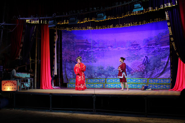 广西博白县与湛江市临近,两地交界处的人们多讲涯话,语言沟通基本无障碍。“双凤”采茶剧团共15人,受邀在7月13日至23日进行为期十天的“涯歌”演出。实践队员到达时,舞台正在表演《泪洒相思地》。