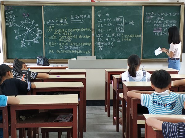 为了更好地解释邻近色的概念,梁颖怡老师在黑板的左侧画下了色环。在大大的色环中,各种颜色按照美术规律进行分布,学生在认真听讲的同时,也拿出了笔记本认真地画下了黑板上的色环。概念的讲解总是略显枯燥的,于是梁颖怡老师通过让同学们猜一猜两种颜色混合后为什么颜色的游戏,充分调动了课堂气氛。在随后的冷暖色调的分析当中,梁颖怡老师点名了两位同学起立。就在两位同学都一头雾水不知所措时,梁颖怡老师让同学们指出两位同学衣服颜色的冷暖色调,意在告诉同学冷暖色调是相对而言的。