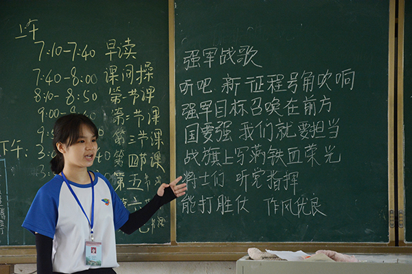 为了增强学生的爱国意识,提高学生对成为新一代青年的自觉意识。7月21日上午,岭南师范学院“诚心诚意”实践队在实践基地臧家小学开展了一门军歌学习课堂,本次课堂在五年级举行,由支教老师林嘉燕教学歌曲《强军战歌》。