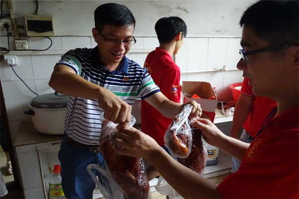 李发武一行人来到厨房进行参观。当得知红土队员们在三下乡中一天的伙食费十分有限,他表示:“大学生辛苦奋斗、勤俭节约是值得肯定的,但是再苦再累也不能太委屈自己。”同时,李发武书记还为红土队员们随行带来了烤鸭和扣肉等其他食物,“趁着今天这个机会,也给大家添几个菜,改善一下伙食。”红土队员们也十分感谢李发武书记的细心关怀。接着,李发武一行人便和队员们一起在食堂享用午餐。期间,他亲切地与队员进行交谈,询问队员们是否适应下乡生活。同时,他也补充道,“大家在下乡期间中,除了做好自己的本职工作外,也要听从队长的安排,发扬队伍努力奋斗、艰苦拼搏的精神。更重要的是,一定要注意安全问题,每个人都要保护好自己,贯彻落实‘安全第一’的原则。”