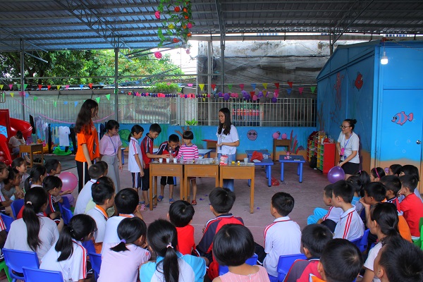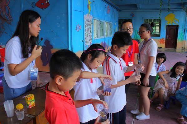 在班主任的指引下,三四年级的学生有序地坐好。任课老师余盈说到,“今天的科普小知识课的内容很贴近生活,你们有经常进厨房吗?知道淀粉遇碘会变成什么颜色?”同学们大声地答道,“红色、黄色、黑色......”余盈微笑着,把碘放入淀粉溶液里,同时她解释道,“淀粉遇碘会变成蓝紫色。”同学们目不转睛地看着老师操作。当颜色转变时,他们露出惊讶的表情。同学们的眼球都被神奇的科普小知识所吸引。