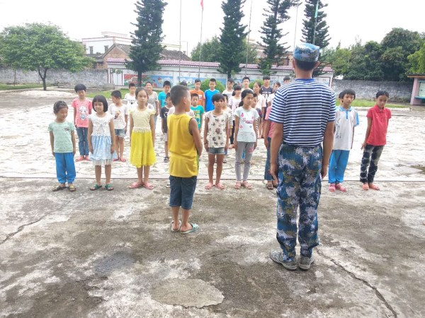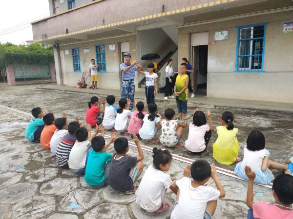 7月21日下午,岭南师范学院“弈鸣”社会实践队队员周潮海给“弈鸣”实践基地光豪小学的全体学生带来了一节别具一格的军训课程。向学生展示了独特的军人风采、军人风范,让学生认识到了纪律的重要性。