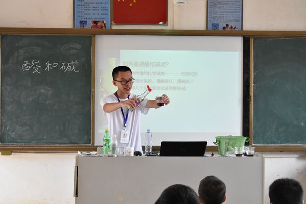 由于前两节的理论知识课较为枯燥,学生的热情略有下降,但当化学老师甘霖为同学们表演了一个小魔术后,同学们瞬间被迷倒。甘霖将少量食用醋滴入紫色石蕊溶液中,溶液颜色神奇地从紫色变为红色。 “这只是生活中一个常见的现象,你们想知道其中的原理吗,接下来我会为大家解答。”甘老师为本次化学课设下悬念,让学生更投入课中。