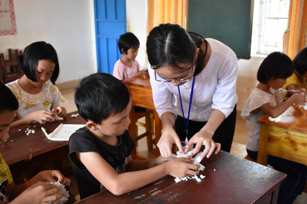 课堂伊始,主讲老师陈吴映首先为同学们分享献纸花悼念革命烈士活动,对学生们进行爱国主义和革命传统教育,教育学生弘扬民族精神。随后向同学们展示她的纸花作品,用ppt的形式同学们介绍纸花的制作方法,并动手示范,以加深同学们对制作方法的印象。接着,陈老师与两位助教老师为学生们分发制作材料手把手教学。同学们按照老师所讲的制作方法与顺序,开始制作纸花,遇到不懂得地方,或与周边同学商讨,或向助教老师的寻求帮助。